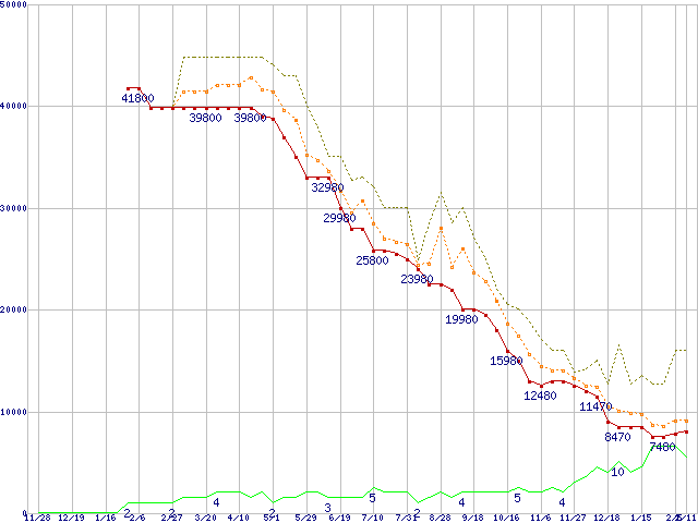 PC3-12800 4GB×2枚組みセットの価格推移↓次グラフ(2009年11月28日〜2011年2月11日)※このグラフは過去のデータも税率5%相当に調整した税込み相当額のグラフです。●関連グラフメモリ主要製品の最安値推移メモリ主要製品(最安値5千円〜1万円未満)の最安値推移PC3-12800(DDR3-1600) DDR3 SDRAM DIMMの最安値推移●凡例最安値(点線部は販売店未確認または未調査)平均値最高値ショップ数