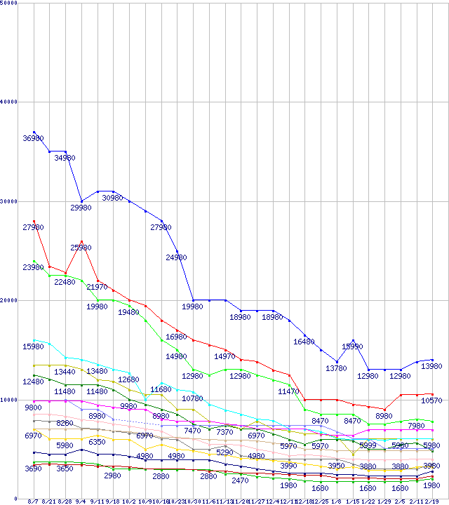 メモリ主要製品の最安値推移↑前グラフ↓次グラフ(2010年8月7日〜2011年2月19日)※このグラフは過去のデータも税率5%相当に調整した税込み相当額のグラフです。凡例PC3-12800 4GB×3枚組みセットPC3-10600 4GB×3枚組みセットPC3-12800 4GB×2枚組みセットPC2-6400 4GBPC3-10600 4GB×2枚組みセットPC3-12800 2GB×3枚組みセットPC3-12800 4GBPC2-6400 2GB×2枚組みセットPC3-10600 2GB×3枚組みセットPC3-12800 2GB×2枚組みセットPC3-10600 4GBPC3-10600 2GB×2枚組みセットPC3-12800 2GBPC2-6400 2GBPC3-10600 2GB※製品名をクリックすると個別のグラフを表示します※点線部は販売店が確認できなかった、または調査データがないことを示します