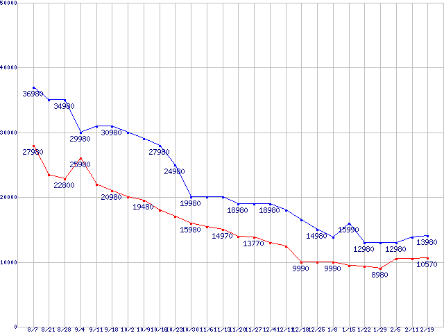 | メモリ主要製品(最安値1万円以上)の最安値推移 |