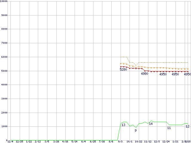 Celeron E3500 (2.7GHz)の価格推移↑前グラフ↓次グラフ(2009年12月4日〜2011年2月18日)※このグラフは過去のデータも税率5%相当に調整した税込み相当額のグラフです。●関連グラフCPU主要製品の最安値推移CPU主要製品(最安値1万円未満)の最安値推移Intel系CPUの最安値推移LGA775 (FSB 800MHz,L2 1MB,Dual Core,TDP 65W)の最安値推移●凡例最安値(点線部は販売店未確認または未調査)平均値最高値ショップ数