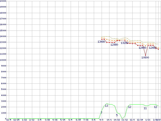 Phenom II X4 955 (3.2GHz,L2 512KB×4,L3 6MB,TDP 95W)の価格推移↑前グラフ↓次グラフ(2009年12月4日〜2011年2月18日)※このグラフは過去のデータも税率5%相当に調整した税込み相当額のグラフです。●関連グラフCPU主要製品の最安値推移CPU主要製品(最安値1万円〜2万円未満)の最安値推移AMD系CPUの最安値推移Socket AM3 (HyperTransport 3.0,Quad Core)の最安値推移●凡例最安値(点線部は販売店未確認または未調査)平均値最高値ショップ数