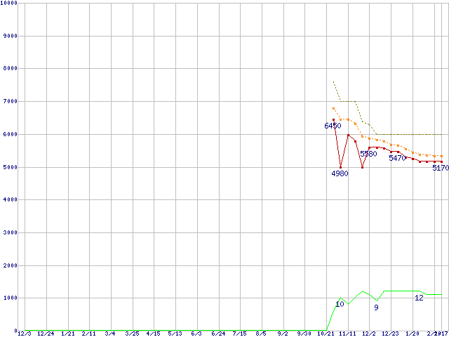 WD10EALX (1TB,32MB)の価格推移↑前グラフ↓次グラフ(2009年12月3日〜2011年2月17日)※このグラフは過去のデータも税率5%相当に調整した税込み相当額のグラフです。●関連グラフHDD/SSD主要製品の最安値推移HDD/SSD主要製品(最安値1万円未満)の最安値推移HDD 1TB〜1.5TB未満の最安値推移WD Caviar Blue (7200rpm,6Gb/s)の最安値推移●凡例最安値(点線部は販売店未確認または未調査)平均値最高値ショップ数