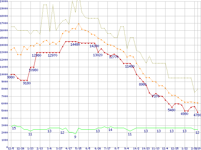 PC3-10600 2GB×3枚組みセットの価格推移↑前グラフ↓次グラフ(2009年12月5日〜2011年2月19日)※このグラフは過去のデータも税率5%相当に調整した税込み相当額のグラフです。●関連グラフメモリ主要製品の最安値推移メモリ主要製品(最安値5千円未満)の最安値推移PC3-10600(DDR3-1333) DDR3 SDRAM DIMMの最安値推移●凡例最安値(点線部は販売店未確認または未調査)平均値最高値ショップ数