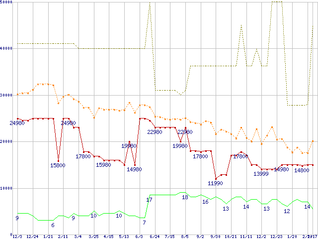 その他2.5インチSSD 128GB (128GB,MLC)の価格推移↑前グラフ↓次グラフ(2009年12月3日〜2011年2月17日)※このグラフは過去のデータも税率5%相当に調整した税込み相当額のグラフです。●関連グラフHDD/SSD主要製品の最安値推移HDD/SSD主要製品(最安値1万円〜1万5千円未満)の最安値推移HDD 100〜160GB未満の最安値推移2.5インチSSD (SSD,3Gbps,2.5インチ)の最安値推移●凡例最安値(点線部は販売店未確認または未調査)平均値最高値ショップ数