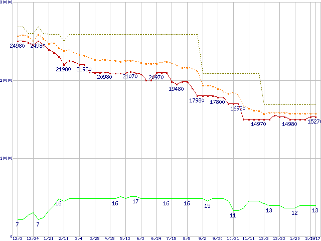 X25-M(G2) (80GB,MLC)の価格推移↑前グラフ↓次グラフ(2009年12月3日〜2011年2月17日)※このグラフは過去のデータも税率5%相当に調整した税込み相当額のグラフです。●関連グラフHDD/SSD主要製品の最安値推移HDD/SSD主要製品(最安値1万5千円〜2万円未満)の最安値推移HDD 80GB〜100GB未満の最安値推移X25-M Mainstream SATA SSD (SSD,3Gbps,2.5インチ)の最安値推移●凡例最安値(点線部は販売店未確認または未調査)平均値最高値ショップ数