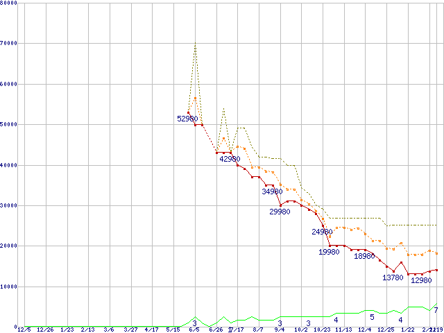 PC3-12800 4GB×3枚組みセットの価格推移↑前グラフ↓次グラフ(2009年12月5日〜2011年2月19日)※このグラフは過去のデータも税率5%相当に調整した税込み相当額のグラフです。●関連グラフメモリ主要製品の最安値推移メモリ主要製品(最安値1万円以上)の最安値推移PC3-12800(DDR3-1600) DDR3 SDRAM DIMMの最安値推移●凡例最安値(点線部は販売店未確認または未調査)平均値最高値ショップ数