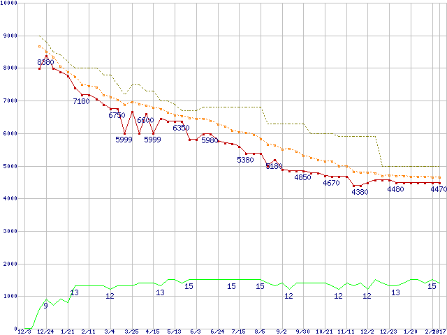 WD10EARS (1TB,64MB)の価格推移↑前グラフ↓次グラフ(2009年12月3日〜2011年2月17日)※このグラフは過去のデータも税率5%相当に調整した税込み相当額のグラフです。●関連グラフHDD/SSD主要製品の最安値推移HDD/SSD主要製品(最安値1万円未満)の最安値推移HDD 1TB〜1.5TB未満の最安値推移WD Caviar Green (3Gb/s)の最安値推移●凡例最安値(点線部は販売店未確認または未調査)平均値最高値ショップ数