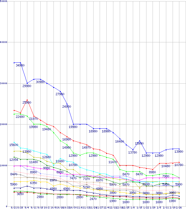 メモリ主要製品の最安値推移↑前グラフ↓次グラフ(2010年8月21日〜2011年2月26日)※このグラフは過去のデータも税率5%相当に調整した税込み相当額のグラフです。凡例PC3-12800 4GB×3枚組みセットPC3-10600 4GB×3枚組みセットPC3-12800 4GB×2枚組みセットPC2-6400 4GBPC3-10600 4GB×2枚組みセットPC3-12800 2GB×3枚組みセットPC3-12800 4GBPC2-6400 2GB×2枚組みセットPC3-10600 2GB×3枚組みセットPC3-12800 2GB×2枚組みセットPC3-10600 4GBPC3-10600 2GB×2枚組みセットPC3-12800 2GBPC2-6400 2GBPC3-10600 2GB※製品名をクリックすると個別のグラフを表示します※点線部は販売店が確認できなかった、または調査データがないことを示します