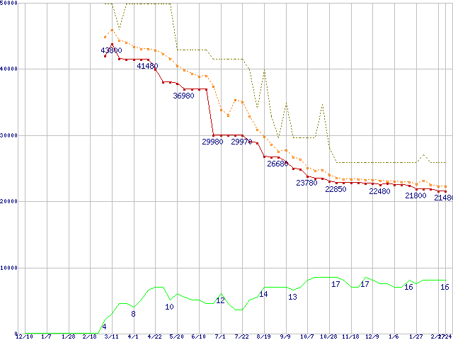 CTFDDAC128MAG-1G1 (128GB,MLC)の価格推移↑前グラフ↓次グラフ(2009年12月10日〜2011年2月24日)※このグラフは過去のデータも税率5%相当に調整した税込み相当額のグラフです。●関連グラフHDD/SSD主要製品の最安値推移HDD/SSD主要製品(最安値2万円以上)の最安値推移HDD 100〜160GB未満の最安値推移RealSSD C300 (SSD,6Gbps,2.5インチ,リード355MB/s・ライト215〜70MB/s)の最安値推移●凡例最安値(点線部は販売店未確認または未調査)平均値最高値ショップ数