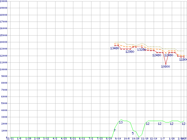 Phenom II X4 955 (3.2GHz,L2 512KB×4,L3 6MB,TDP 95W)の価格推移↑前グラフ↓次グラフ(2009年12月11日〜2011年2月25日)※このグラフは過去のデータも税率5%相当に調整した税込み相当額のグラフです。●関連グラフCPU主要製品の最安値推移CPU主要製品(最安値1万円〜2万円未満)の最安値推移AMD系CPUの最安値推移Socket AM3 (HyperTransport 3.0,Quad Core)の最安値推移●凡例最安値(点線部は販売店未確認または未調査)平均値最高値ショップ数