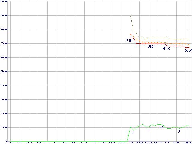 Athlon II X2 250e (3.0GHz,L2 1MB×2,TDP 45W)の価格推移↑前グラフ↓次グラフ(2009年12月11日〜2011年2月25日)※このグラフは過去のデータも税率5%相当に調整した税込み相当額のグラフです。●関連グラフCPU主要製品の最安値推移CPU主要製品(最安値1万円未満)の最安値推移AMD系CPUの最安値推移Socket AM3 (Dual Core)の最安値推移●凡例最安値(点線部は販売店未確認または未調査)平均値最高値ショップ数
