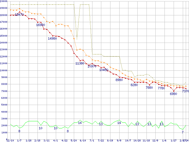ST32000542AS (2TB,32MB)の価格推移↑前グラフ↓次グラフ(2009年12月10日〜2011年2月24日)※このグラフは過去のデータも税率5%相当に調整した税込み相当額のグラフです。●関連グラフHDD/SSD主要製品の最安値推移HDD/SSD主要製品(最安値1万円未満)の最安値推移HDD 2TB〜2.5TB未満の最安値推移Barracuda LP (5900rpm,3Gb/s)の最安値推移●凡例最安値(点線部は販売店未確認または未調査)平均値最高値ショップ数