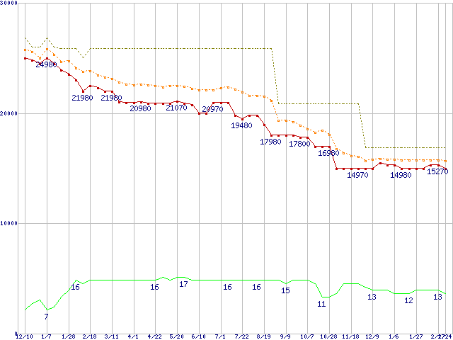 X25-M(G2) (80GB,MLC)の価格推移↑前グラフ↓次グラフ(2009年12月10日〜2011年2月24日)※このグラフは過去のデータも税率5%相当に調整した税込み相当額のグラフです。●関連グラフHDD/SSD主要製品の最安値推移HDD/SSD主要製品(最安値1万円〜1万5千円未満)の最安値推移HDD 80GB〜100GB未満の最安値推移X25-M Mainstream SATA SSD (SSD,3Gbps,2.5インチ)の最安値推移●凡例最安値(点線部は販売店未確認または未調査)平均値最高値ショップ数