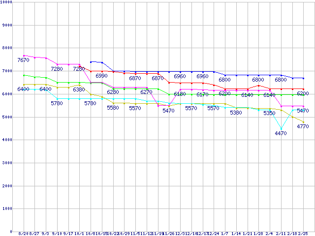 Socket AM3 (Dual Core)の最安値推移↑前グラフ↓次グラフ(2010年8月20日〜2011年2月25日)※このグラフは過去のデータも税率5%相当に調整した税込み相当額のグラフです。凡例Athlon II X2 250e (3.0GHz,L2 1MB×2,TDP 45W)Athlon II X2 265 (3.3GHz,L2 1MB×2,TDP 65W)Athlon II X2 260 (3.2GHz,L2 1MB×2,TDP 65W)Athlon II X2 245e (2.9GHz,L2 1MB×2,TDP 45W)Athlon II X2 255 (3.1GHz,L2 1MB×2,TDP 65W)Athlon II X2 240e (2.8GHz,L2 1MB×2,TDP 45W)※製品名をクリックすると個別のグラフを表示します※点線部は販売店が確認できなかった、または調査データがないことを示します