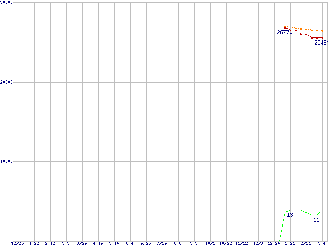 Core i7-2600 (3.40GHz)の価格推移↑前グラフ↓次グラフ(2009年12月25日〜2011年3月4日)※このグラフは過去のデータも税率5%相当に調整した税込み相当額のグラフです。●関連グラフCPU主要製品の最安値推移CPU主要製品(最安値2万円〜3万円未満)の最安値推移Intel系CPUの最安値推移LGA1155 (Smart Cache 8MB,Quad Core,GPU内蔵,Hyper-Threading,TDP 95W)の最安値推移●凡例最安値(点線部は販売店未確認または未調査)平均値最高値ショップ数