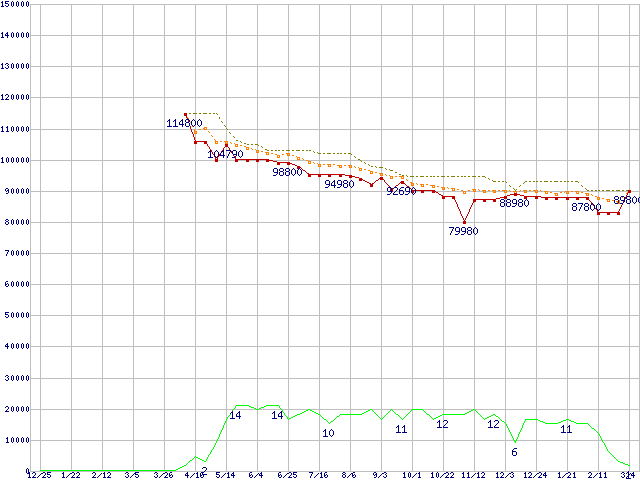 Core i7-980X Extreme Edition (3.33GHz)の価格推移↑前グラフ↓次グラフ(2009年12月25日〜2011年3月4日)※このグラフは過去のデータも税率5%相当に調整した税込み相当額のグラフです。●関連グラフCPU主要製品の最安値推移CPU主要製品(最安値6万円以上)の最安値推移Intel系CPUの最安値推移LGA1366 (QPI 6.4GT/s,L3キャッシュ12MB,6Core,Hyper-Threading,TDP 130W)の最安値推移●凡例最安値(点線部は販売店未確認または未調査)平均値最高値ショップ数
