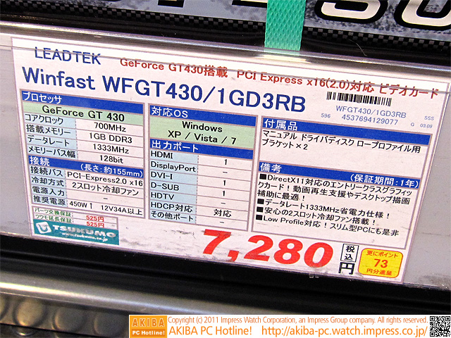 AKIBA PC Hotline! 2011年3月12日号今週見つけた新製品:ビデオカード [拡大画像]Leadtek WinFast GT 430(WFGT430-1GD3RB)前の画像←[記事に戻る]