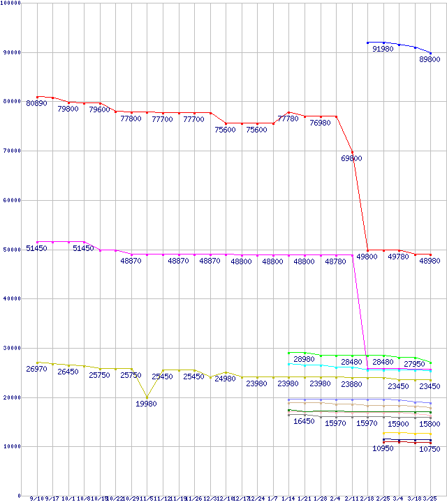 Intel系CPUの最安値推移↑前グラフ↓次グラフ(2010年9月10日〜2011年3月25日)※このグラフは過去のデータも税率5%相当に調整した税込み相当額のグラフです。凡例Core i7-990X Extreme Edition (3.46GHz)Core i7-970 (3.2GHz)Core i7-2600K (3.40GHz)Core i7-960 (3.20GHz)Core i7-2600 (3.40GHz)Core i7-950 (3.06GHz)Core i5-2500K (3.30GHz,TDP 95W)Core i5-2500 (3.30GHz,TDP 95W)Core i5-2400S (2.50GHz,TDP 65W)Core i5-2400 (3.10GHz,TDP 95W)Core i5-2300 (2.80GHz,TDP 95W)Core i3-2120 (3.3GHz,TDP 65W)Core i3-2100T (2.50GHz,TDP 35W)Core i3-2100 (3.1GHz,TDP 65W)※製品名をクリックすると個別のグラフを表示します※点線部は販売店が確認できなかった、または調査データがないことを示します