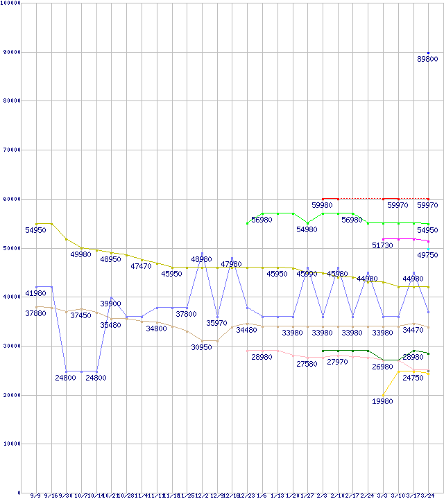 HDD/SSD主要製品(最安値2万円以上)の最安値推移↑前グラフ(2010年9月9日〜2011年3月24日)※このグラフは過去のデータも税率5%相当に調整した税込み相当額のグラフです。凡例MTFDDAC512MAM-1K1 (512GB,MLC)CSSD-P3256GB2-BRKT (256GB,MLC)PX-256M2S (256GB,MLC)SSDSC2MH250A2K5 (250GB,MLC)MTFDDAC256MAM-1K1 (256GB,MLC)CTFDDAC256MAG-1G1 (256GB,MLC)その他2.5インチSSD 256GB (256GB,MLC)X25-M(G2) (160GB,MLC)CSSD-P3128GB2-BRKT (128GB,MLC)PX-128M2S (128GB,MLC)MTFDDAC128MAM-1J1 (128GB,MLC)SSDSC2MH120A2K5 (120GB,MLC)※製品名をクリックすると個別のグラフを表示します※点線部は販売店が確認できなかった、または調査データがないことを示します