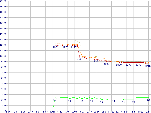 Athlon II X4 640 (3.0GHz,L2 512KB×4,TDP 95W)の価格推移↑前グラフ↓次グラフ(2010年1月15日〜2011年3月25日)※このグラフは過去のデータも税率5%相当に調整した税込み相当額のグラフです。●関連グラフCPU主要製品の最安値推移CPU主要製品(最安値1万円未満)の最安値推移AMD系CPUの最安値推移Socket AM3 (Quad Core)の最安値推移●凡例最安値(点線部は販売店未確認または未調査)平均値最高値ショップ数