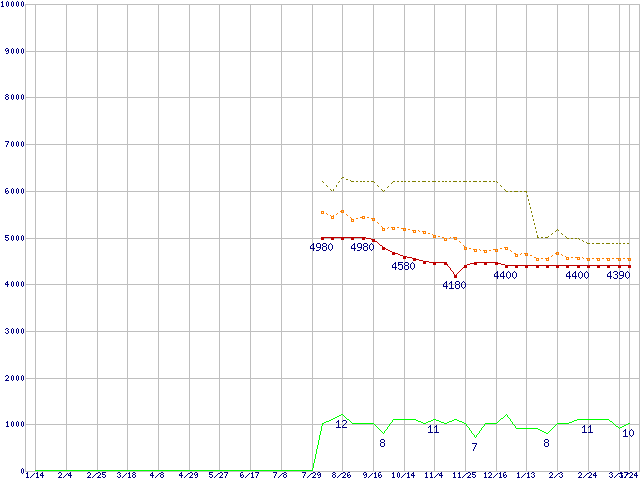 0S02598 (500GB,8MB)の価格推移↑前グラフ↓次グラフ(2010年1月14日〜2011年3月24日)※このグラフは過去のデータも税率5%相当に調整した税込み相当額のグラフです。●関連グラフHDD/SSD主要製品の最安値推移HDD/SSD主要製品(最安値1万円未満)の最安値推移HDD 500〜600GB未満の最安値推移TRAVELSTAR (5400rpm,3Gb/s,2.5インチ)の最安値推移●凡例最安値(点線部は販売店未確認または未調査)平均値最高値ショップ数