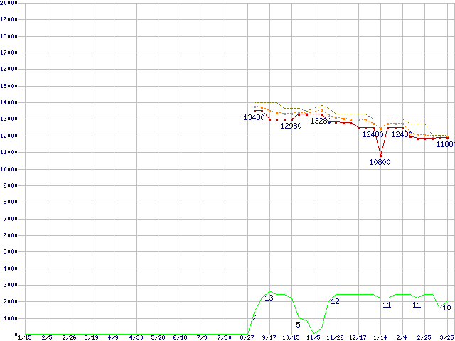 Phenom II X4 955 (3.2GHz,L2 512KB×4,L3 6MB,TDP 95W)の価格推移↑前グラフ↓次グラフ(2010年1月15日〜2011年3月25日)※このグラフは過去のデータも税率5%相当に調整した税込み相当額のグラフです。●関連グラフCPU主要製品の最安値推移CPU主要製品(最安値1万円〜2万円未満)の最安値推移AMD系CPUの最安値推移Socket AM3 (HyperTransport 3.0,Quad Core)の最安値推移●凡例最安値(点線部は販売店未確認または未調査)平均値最高値ショップ数