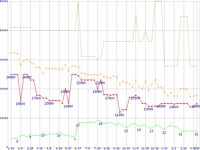 その他2.5インチSSD 128GB (128GB,MLC)の価格推移↑前グラフ↓次グラフ(2010年1月14日〜2011年3月24日)※このグラフは過去のデータも税率5%相当に調整した税込み相当額のグラフです。●関連グラフHDD/SSD主要製品の最安値推移HDD/SSD主要製品(最安値1万円〜1万5千円未満)の最安値推移HDD 100〜160GB未満の最安値推移2.5インチSSD (SSD,3Gbps,2.5インチ)の最安値推移●凡例最安値(点線部は販売店未確認または未調査)平均値最高値ショップ数