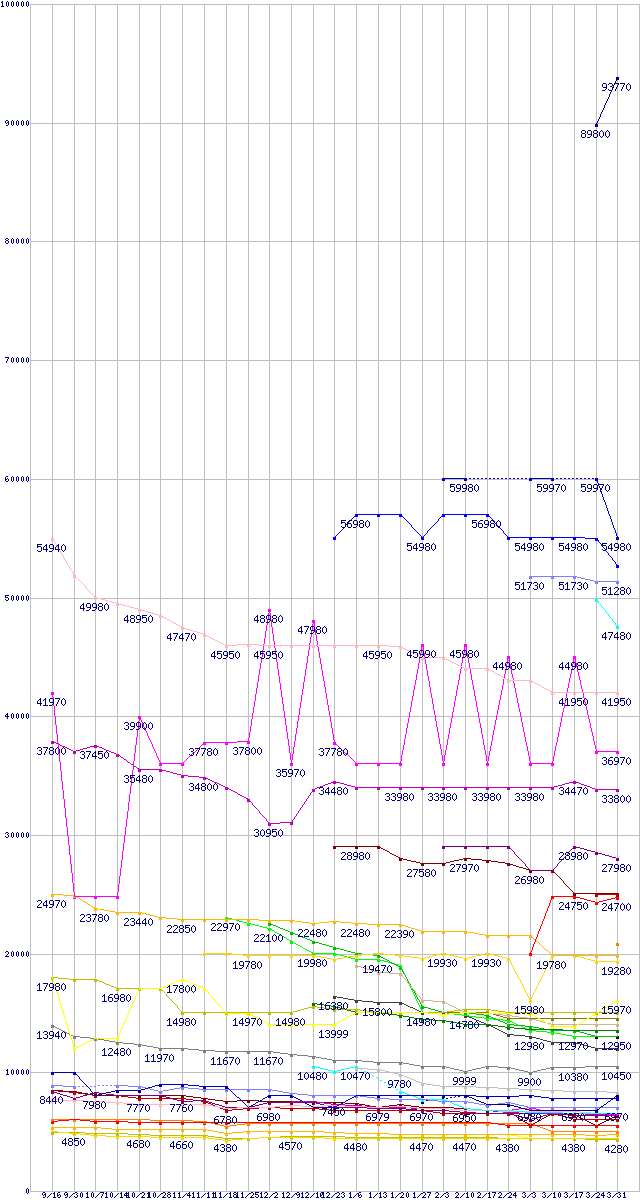 HDD/SSD主要製品の最安値推移↑前グラフ↓次グラフ(2010年9月16日〜2011年3月31日)※このグラフは過去のデータも税率5%相当に調整した税込み相当額のグラフです。凡例MTFDDAC512MAM-1K1 (512GB,MLC)CSSD-P3256GB2-BRKT (256GB,MLC)PX-256M2S (256GB,MLC)SSDSC2MH250A2K5 (250GB,MLC)MTFDDAC256MAM-1K1 (256GB,MLC)CTFDDAC256MAG-1G1 (256GB,MLC)その他2.5インチSSD 256GB (256GB,MLC)X25-M(G2) (160GB,MLC)CSSD-P3128GB2-BRKT (128GB,MLC)PX-128M2S (128GB,MLC)MTFDDAC128MAM-1J1 (128GB,MLC)SSDSC2MH120A2K5 (120GB,MLC)ST33000651AS (3TB,64MB)CTFDDAC128MAG-1G1 (128GB,MLC)X25-M(G2) (120GB,MLC)その他2.5インチSSD 128GB (128GB,MLC)X25-M(G2) (80GB,MLC)CSSD-P364GB2-BRKT (64GB,MLC)0S03088(純正パッケージ品) (3TB,64MB)WD2002FAEX (2TB,64MB)WD30EZRSDTL (3TB,64MB,SATAカード付属)WD30EZRS (3TB,64MB)MTFDDAC064MAM-1J1 (64GB,MLC)PX-64M2S (64GB,MLC)CTFDDAC064MAG-1G1 (64GB,MLC)0S03191(純正パッケージ品) (2TB,64MB)HM100UI (1TB,8MB)その他2.5インチSSD 64GB (64GB,MLC)0S03224(純正パッケージ品) (2TB,32MB)WD10TPVT (1TB,8MB,12.5mm厚)ST2000DL003 (2TB,64MB)WD1002FAEX (1TB,64MB)ST2000DL001 (2TB,64MB)0S03085 (750GB,8MB)HD204UI (2TB,32MB)WD20EARS (2TB,64MB)WD7500BPVT (750GB,8MB)WD6400BPVT (640GB,8MB)WD15EARS (1.5TB,64MB)0S02601(純正パッケージ品) (1TB,32MB)0S02598 (500GB,8MB)ST31000524AS (1TB,32MB)WD10EARS (1TB,64MB)※製品名をクリックすると個別のグラフを表示します※点線部は販売店が確認できなかった、または調査データがないことを示します