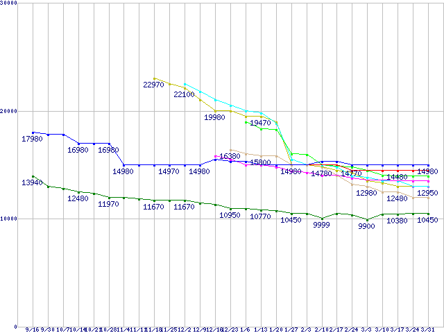 | HDD/SSD主要製品(最安値1万円〜1万5千円未満)の最安値推移 |