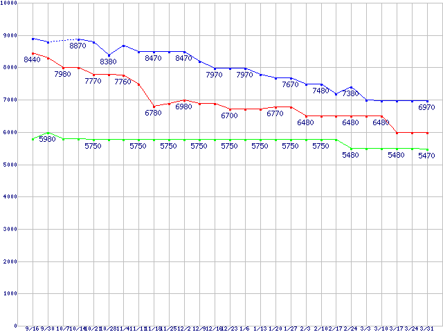 | WD Scorpio Blue (5200〜5400rpm,3Gb/s,2.5インチ)の最安値推移 |