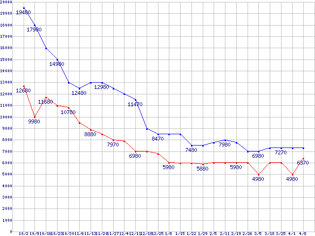| メモリ主要製品(最安値5千円〜1万円未満)の最安値推移 |
