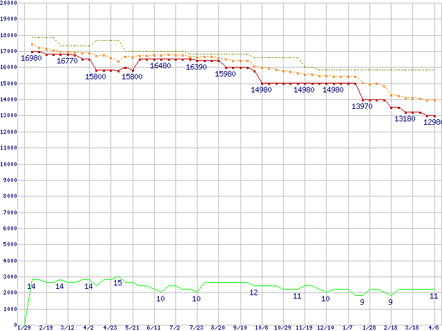 Phenom II X4 910e (2.6GHz,L2 512KB×4,L3 6MB,TDP 65W)の価格推移↑前グラフ↓次グラフ(2010年1月29日〜2011年4月8日)※このグラフは過去のデータも税率5%相当に調整した税込み相当額のグラフです。●関連グラフCPU主要製品の最安値推移CPU主要製品(最安値1万円〜2万円未満)の最安値推移AMD系CPUの最安値推移Socket AM3 (HyperTransport 3.0,Quad Core)の最安値推移●凡例最安値(点線部は販売店未確認または未調査)平均値最高値ショップ数