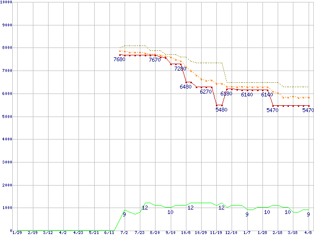 Athlon II X2 245e (2.9GHz,L2 1MB×2,TDP 45W)の価格推移↑前グラフ↓次グラフ(2010年1月29日〜2011年4月8日)※このグラフは過去のデータも税率5%相当に調整した税込み相当額のグラフです。●関連グラフCPU主要製品の最安値推移CPU主要製品(最安値1万円未満)の最安値推移AMD系CPUの最安値推移Socket AM3 (Dual Core)の最安値推移●凡例最安値(点線部は販売店未確認または未調査)平均値最高値ショップ数