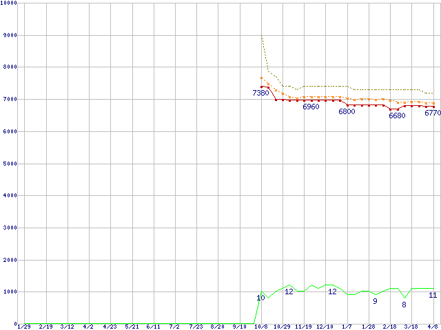 Athlon II X2 250e (3.0GHz,L2 1MB×2,TDP 45W)の価格推移↑前グラフ↓次グラフ(2010年1月29日〜2011年4月8日)※このグラフは過去のデータも税率5%相当に調整した税込み相当額のグラフです。●関連グラフCPU主要製品の最安値推移CPU主要製品(最安値1万円未満)の最安値推移AMD系CPUの最安値推移Socket AM3 (Dual Core)の最安値推移●凡例最安値(点線部は販売店未確認または未調査)平均値最高値ショップ数