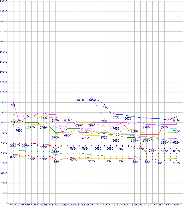 HDD/SSD主要製品(最安値1万円未満)の最安値推移↑前グラフ↓次グラフ(2010年9月30日〜2011年4月14日)※このグラフは過去のデータも税率5%相当に調整した税込み相当額のグラフです。凡例0S03191(純正パッケージ品) (2TB,64MB)HM100UI (1TB,8MB)SSD 320 (40GB,MLC)その他2.5インチSSD 64GB (64GB,MLC)0S03224(純正パッケージ品) (2TB,32MB)WD10TPVT (1TB,8MB,12.5mm厚)ST2000DL003 (2TB,64MB)WD1002FAEX (1TB,64MB)HD204UI (2TB,32MB)WD20EARS (2TB,64MB)0S03085 (750GB,8MB)WD7500BPVT (750GB,8MB)WD6400BPVT (640GB,8MB)WD15EARS (1.5TB,64MB)0S02601(純正パッケージ品) (1TB,32MB)ST31000524AS (1TB,32MB)0S02598 (500GB,8MB)WD10EARS (1TB,64MB)※製品名をクリックすると個別のグラフを表示します※点線部は販売店が確認できなかった、または調査データがないことを示します