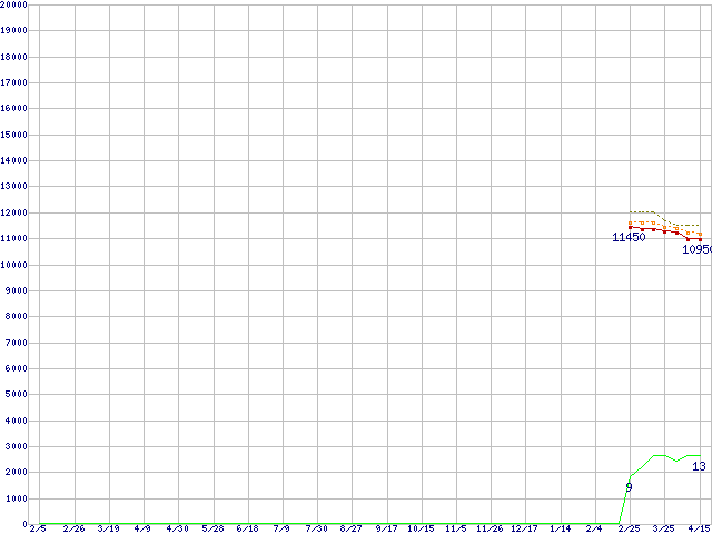 Core i3-2100T (2.50GHz,TDP 35W)の価格推移↑前グラフ↓次グラフ(2010年2月5日〜2011年4月15日)※このグラフは過去のデータも税率5%相当に調整した税込み相当額のグラフです。●関連グラフCPU主要製品の最安値推移CPU主要製品(最安値1万円〜2万円未満)の最安値推移Intel系CPUの最安値推移LGA1155 (Smart Cache 3MB,Dual Core,GPU内蔵,Hyper-Threading)の最安値推移●凡例最安値(点線部は販売店未確認または未調査)平均値最高値ショップ数