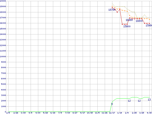 Phenom II X6 1065T (2.9GHz,L2 512KB×6,L3 6MB,TDP 95W)の価格推移↑前グラフ↓次グラフ(2010年2月5日〜2011年4月15日)※このグラフは過去のデータも税率5%相当に調整した税込み相当額のグラフです。●関連グラフCPU主要製品の最安値推移CPU主要製品(最安値1万円〜2万円未満)の最安値推移AMD系CPUの最安値推移Socket AM3 (HyperTransport 3.0,6Core)の最安値推移●凡例最安値(点線部は販売店未確認または未調査)平均値最高値ショップ数