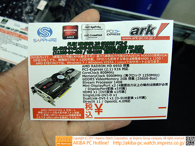 AKIBA PC Hotline!今週見つけた新製品:ビデオカード [拡大画像]SAPPHIRE FLEX HD6950 2G GDDR5 PCI-E DL-DVI-I+SL-DVI-D/HDMI/DUAL MINI DP前の画像←→次の画像