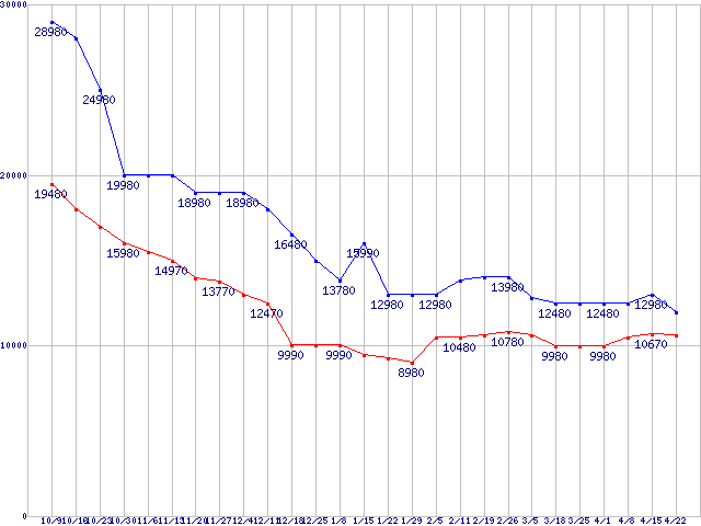 | メモリ主要製品(最安値1万円以上)の最安値推移 |