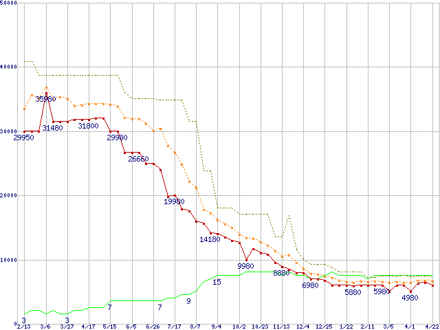 PC3-10600 4GB×2枚組みセットの価格推移↑前グラフ↓次グラフ(2010年2月13日〜2011年4月22日)※このグラフは過去のデータも税率5%相当に調整した税込み相当額のグラフです。●関連グラフメモリ主要製品の最安値推移メモリ主要製品(最安値5千円〜1万円未満)の最安値推移PC3-10600(DDR3-1333) DDR3 SDRAM DIMMの最安値推移●凡例最安値(点線部は販売店未確認または未調査)平均値最高値ショップ数