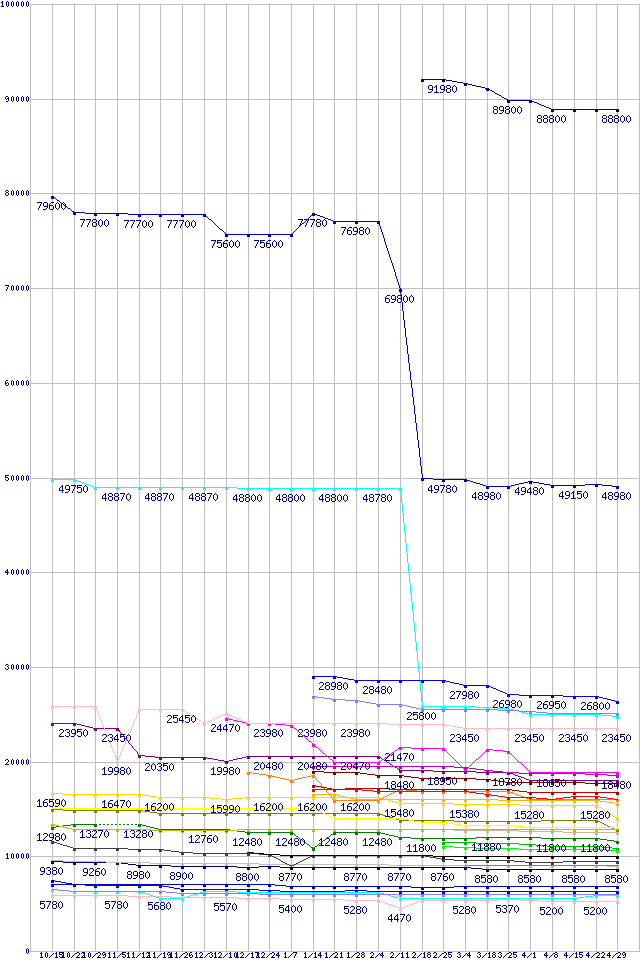CPU主要製品の最安値推移↑前グラフ↓次グラフ(2010年10月15日〜2011年4月29日)※このグラフは過去のデータも税率5%相当に調整した税込み相当額のグラフです。凡例Core i7-990X Extreme Edition (3.46GHz)Core i7-970 (3.2GHz)Core i7-2600K (3.40GHz)Core i7-2600 (3.40GHz)Core i7-960 (3.20GHz)Core i7-950 (3.06GHz)Phenom II X6 1100T Black Edition (3.3GHz,L2 512KB×6,L3 6MB,TDP 125W)Core i5-2500K (3.30GHz,TDP 95W)Phenom II X6 1090T Black Edition (3.2GHz,L2 512KB×6,L3 6MB,TDP 125W)Core i5-2500 (3.30GHz,TDP 95W)Core i5-2400S (2.50GHz,TDP 65W)Core i5-2400 (3.10GHz,TDP 95W)Phenom II X6 1065T (2.9GHz,L2 512KB×6,L3 6MB,TDP 95W)Core i5-2300 (2.80GHz,TDP 95W)Phenom II X4 970 Black Edition (3.5GHz,L2 512KB×4,L3 6MB,TDP 125W)Phenom II X4 910e (2.6GHz,L2 512KB×4,L3 6MB,TDP 65W)Athlon II X4 615e (2.5GHz,L2 512KB×4,TDP 45W)Phenom II X4 965 Black Edition (3.4GHz,L2 512KB×4,L3 6MB,TDP 125W)Core i3-2120 (3.3GHz,TDP 65W)Phenom II X4 955 (3.2GHz,L2 512KB×4,L3 6MB,TDP 95W)Core i3-2100T (2.50GHz,TDP 35W)Core i3-2100 (3.1GHz,TDP 65W)Phenom II X2 565 Black Edition (3.4GHz,L2 512KB×2,L3 6MB)Athlon II X4 645 (3.1GHz,L2 512KB×4,TDP 95W)Phenom II X4 905e (2.5GHz,L2 512KB×4,L3 6MB,TDP 65W)Phenom II X2 560 Black Edition (3.3GHz,L2 512KB×2,L3 6MB)Athlon II X4 640 (3.0GHz,L2 512KB×4,TDP 95W)Athlon II X2 250e (3.0GHz,L2 1MB×2,TDP 45W)Athlon II X2 265 (3.3GHz,L2 1MB×2,TDP 65W)Athlon II X2 260 (3.2GHz,L2 1MB×2,TDP 65W)Athlon II X2 245e (2.9GHz,L2 1MB×2,TDP 45W)Athlon II X2 255 (3.1GHz,L2 1MB×2,TDP 65W)※製品名をクリックすると個別のグラフを表示します※点線部は販売店が確認できなかった、または調査データがないことを示します