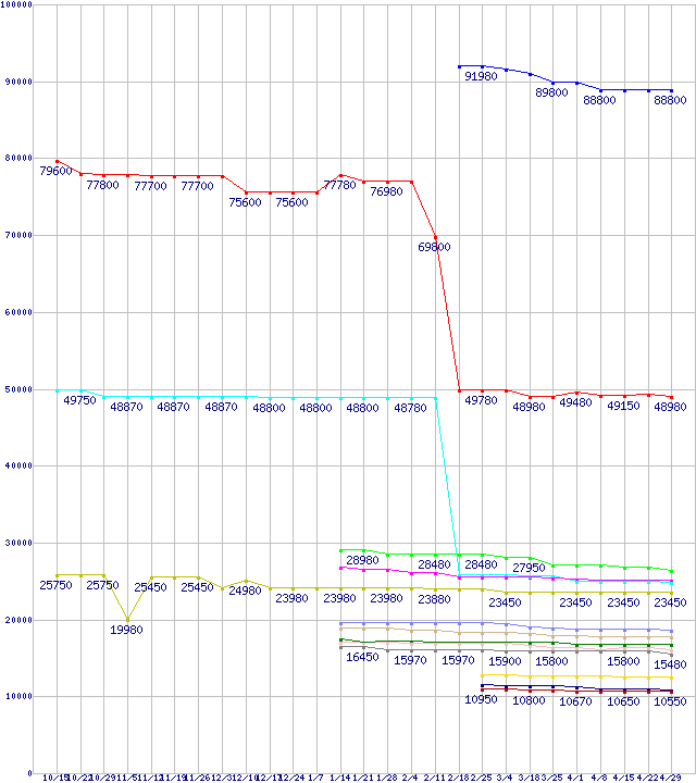 Intel系CPUの最安値推移↑前グラフ↓次グラフ(2010年10月15日〜2011年4月29日)※このグラフは過去のデータも税率5%相当に調整した税込み相当額のグラフです。凡例Core i7-990X Extreme Edition (3.46GHz)Core i7-970 (3.2GHz)Core i7-2600K (3.40GHz)Core i7-2600 (3.40GHz)Core i7-960 (3.20GHz)Core i7-950 (3.06GHz)Core i5-2500K (3.30GHz,TDP 95W)Core i5-2500 (3.30GHz,TDP 95W)Core i5-2400S (2.50GHz,TDP 65W)Core i5-2400 (3.10GHz,TDP 95W)Core i5-2300 (2.80GHz,TDP 95W)Core i3-2120 (3.3GHz,TDP 65W)Core i3-2100T (2.50GHz,TDP 35W)Core i3-2100 (3.1GHz,TDP 65W)※製品名をクリックすると個別のグラフを表示します※点線部は販売店が確認できなかった、または調査データがないことを示します