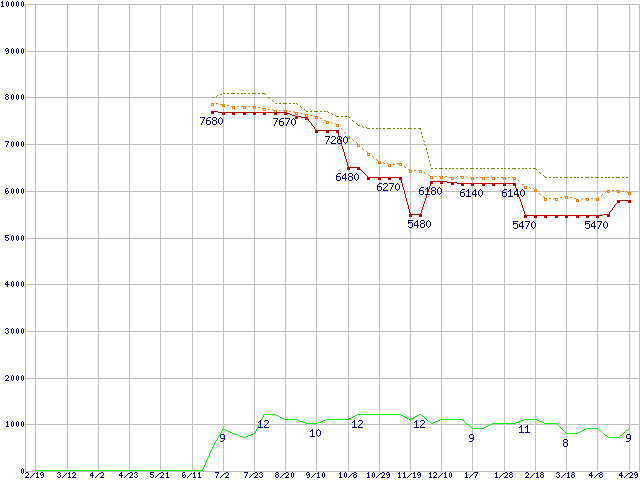 Athlon II X2 245e (2.9GHz,L2 1MB×2,TDP 45W)の価格推移↑前グラフ↓次グラフ(2010年2月19日〜2011年4月29日)※このグラフは過去のデータも税率5%相当に調整した税込み相当額のグラフです。●関連グラフCPU主要製品の最安値推移CPU主要製品(最安値1万円未満)の最安値推移AMD系CPUの最安値推移Socket AM3 (Dual Core)の最安値推移●凡例最安値(点線部は販売店未確認または未調査)平均値最高値ショップ数