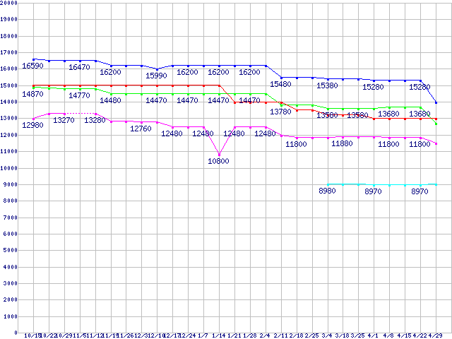 Phenom II X4の最安値推移↑前グラフ(2010年10月15日〜2011年4月29日)※このグラフは過去のデータも税率5%相当に調整した税込み相当額のグラフです。凡例Phenom II X4 970 Black Edition (3.5GHz,L2 512KB×4,L3 6MB,TDP 125W)Phenom II X4 910e (2.6GHz,L2 512KB×4,L3 6MB,TDP 65W)Phenom II X4 965 Black Edition (3.4GHz,L2 512KB×4,L3 6MB,TDP 125W)Phenom II X4 955 (3.2GHz,L2 512KB×4,L3 6MB,TDP 95W)Phenom II X4 905e (2.5GHz,L2 512KB×4,L3 6MB,TDP 65W)※製品名をクリックすると個別のグラフを表示します※点線部は販売店が確認できなかった、または調査データがないことを示します