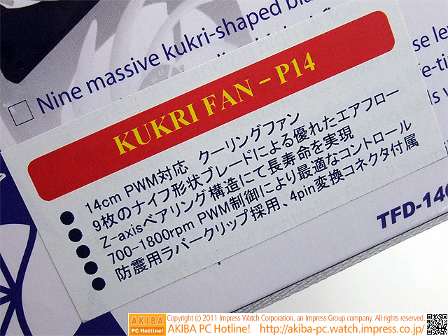 ![]() | AKIBA PC Hotline! 今週見つけた新製品:ファン/冷却関連製品 [拡大画像]TITAN KUKRI FAN-12(TFD-12025SL12Z/KU(RB)) TITAN KUKRI FAN-14(TFD-14025L12Z/KU(RB)) TITAN KUKRI FAN-P14(TFD-14025H12ZP/KU(RB)) |