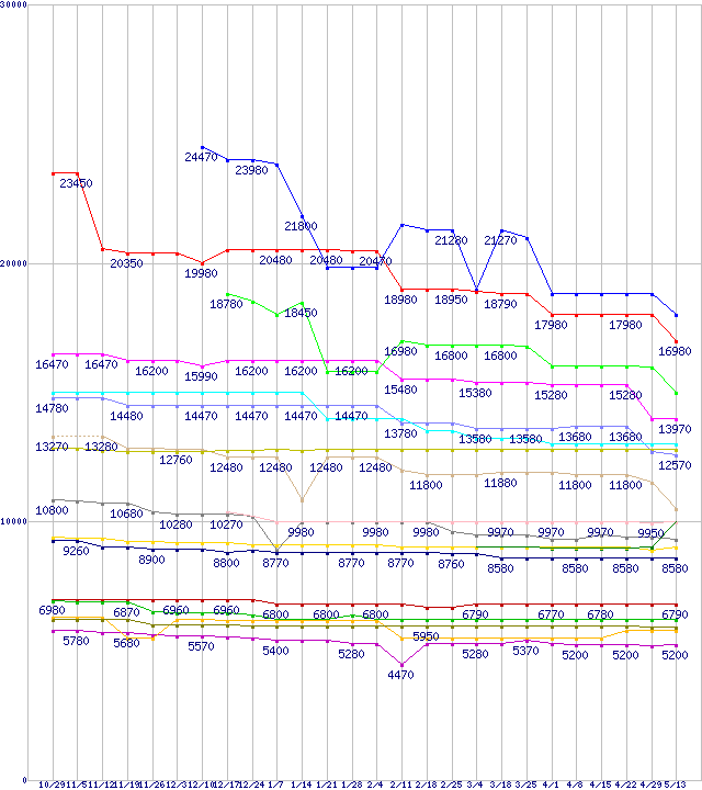 AMD系CPUの最安値推移↑前グラフ↓次グラフ(2010年10月29日〜2011年5月13日)※このグラフは過去のデータも税率5%相当に調整した税込み相当額のグラフです。凡例Phenom II X6 1100T Black Edition (3.3GHz,L2 512KB×6,L3 6MB,TDP 125W)Phenom II X6 1090T Black Edition (3.2GHz,L2 512KB×6,L3 6MB,TDP 125W)Phenom II X6 1065T (2.9GHz,L2 512KB×6,L3 6MB,TDP 95W)Phenom II X4 970 Black Edition (3.5GHz,L2 512KB×4,L3 6MB,TDP 125W)Phenom II X4 910e (2.6GHz,L2 512KB×4,L3 6MB,TDP 65W)Athlon II X4 615e (2.5GHz,L2 512KB×4,TDP 45W)Phenom II X4 965 Black Edition (3.4GHz,L2 512KB×4,L3 6MB,TDP 125W)Phenom II X4 955 (3.2GHz,L2 512KB×4,L3 6MB,TDP 95W)Phenom II X4 905e (2.5GHz,L2 512KB×4,L3 6MB,TDP 65W)Phenom II X2 565 Black Edition (3.4GHz,L2 512KB×2,L3 6MB)Athlon II X4 645 (3.1GHz,L2 512KB×4,TDP 95W)Phenom II X2 560 Black Edition (3.3GHz,L2 512KB×2,L3 6MB)Athlon II X4 640 (3.0GHz,L2 512KB×4,TDP 95W)Athlon II X2 250e (3.0GHz,L2 1MB×2,TDP 45W)Athlon II X2 265 (3.3GHz,L2 1MB×2,TDP 65W)Athlon II X2 260 (3.2GHz,L2 1MB×2,TDP 65W)Athlon II X2 245e (2.9GHz,L2 1MB×2,TDP 45W)Athlon II X2 255 (3.1GHz,L2 1MB×2,TDP 65W)※製品名をクリックすると個別のグラフを表示します※点線部は販売店が確認できなかった、または調査データがないことを示します