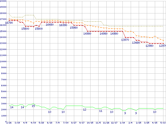 Phenom II X4 910e (2.6GHz,L2 512KB×4,L3 6MB,TDP 65W)の価格推移↑前グラフ↓次グラフ(2010年2月26日〜2011年5月13日)※このグラフは過去のデータも税率5%相当に調整した税込み相当額のグラフです。●関連グラフCPU主要製品の最安値推移CPU主要製品(最安値1万円〜2万円未満)の最安値推移AMD系CPUの最安値推移Socket AM3 (HyperTransport 3.0,Quad Core)の最安値推移●凡例最安値(点線部は販売店未確認または未調査)平均値最高値ショップ数