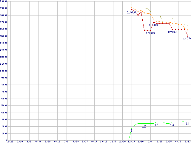 Phenom II X6 1065T (2.9GHz,L2 512KB×6,L3 6MB,TDP 95W)の価格推移↑前グラフ↓次グラフ(2010年2月26日〜2011年5月13日)※このグラフは過去のデータも税率5%相当に調整した税込み相当額のグラフです。●関連グラフCPU主要製品の最安値推移CPU主要製品(最安値1万円〜2万円未満)の最安値推移AMD系CPUの最安値推移Socket AM3 (HyperTransport 3.0,6Core)の最安値推移Phenom II X6の最安値推移●凡例最安値(点線部は販売店未確認または未調査)平均値最高値ショップ数