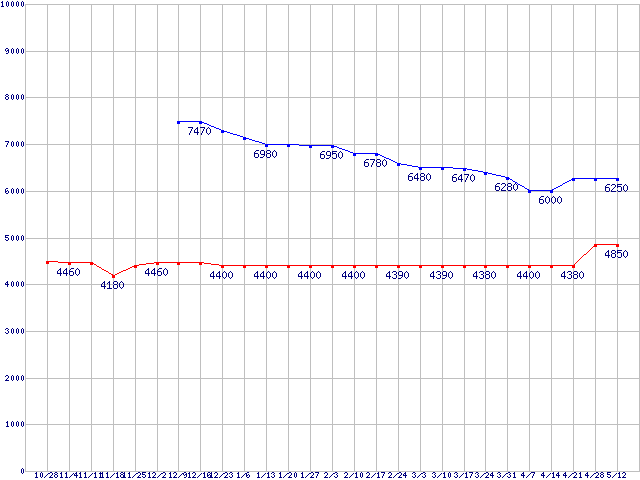 | TRAVELSTAR (5400rpm,3Gb/s,2.5インチ)の最安値推移 |