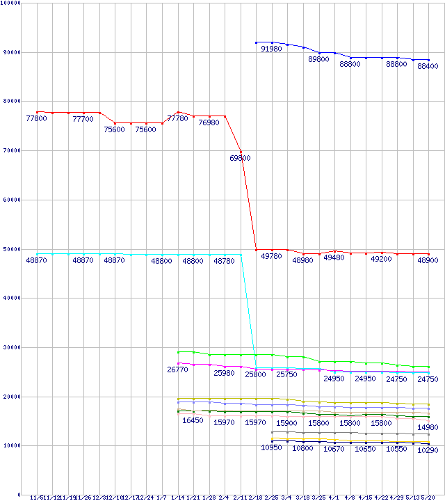 Intel系CPUの最安値推移↑前グラフ↓次グラフ(2010年11月5日〜2011年5月20日)※このグラフは過去のデータも税率5%相当に調整した税込み相当額のグラフです。凡例Core i7-990X Extreme Edition (3.46GHz)Core i7-970 (3.2GHz)Core i7-2600K (3.40GHz)Core i7-2600 (3.40GHz)Core i7-960 (3.20GHz)Core i5-2500K (3.30GHz,TDP 95W)Core i5-2500 (3.30GHz,TDP 95W)Core i5-2400S (2.50GHz,TDP 65W)Core i5-2400 (3.10GHz,TDP 95W)Core i5-2300 (2.80GHz,TDP 95W)Core i3-2120 (3.3GHz,TDP 65W)Core i3-2100T (2.50GHz,TDP 35W)Core i3-2100 (3.1GHz,TDP 65W)※製品名をクリックすると個別のグラフを表示します※点線部は販売店が確認できなかった、または調査データがないことを示します